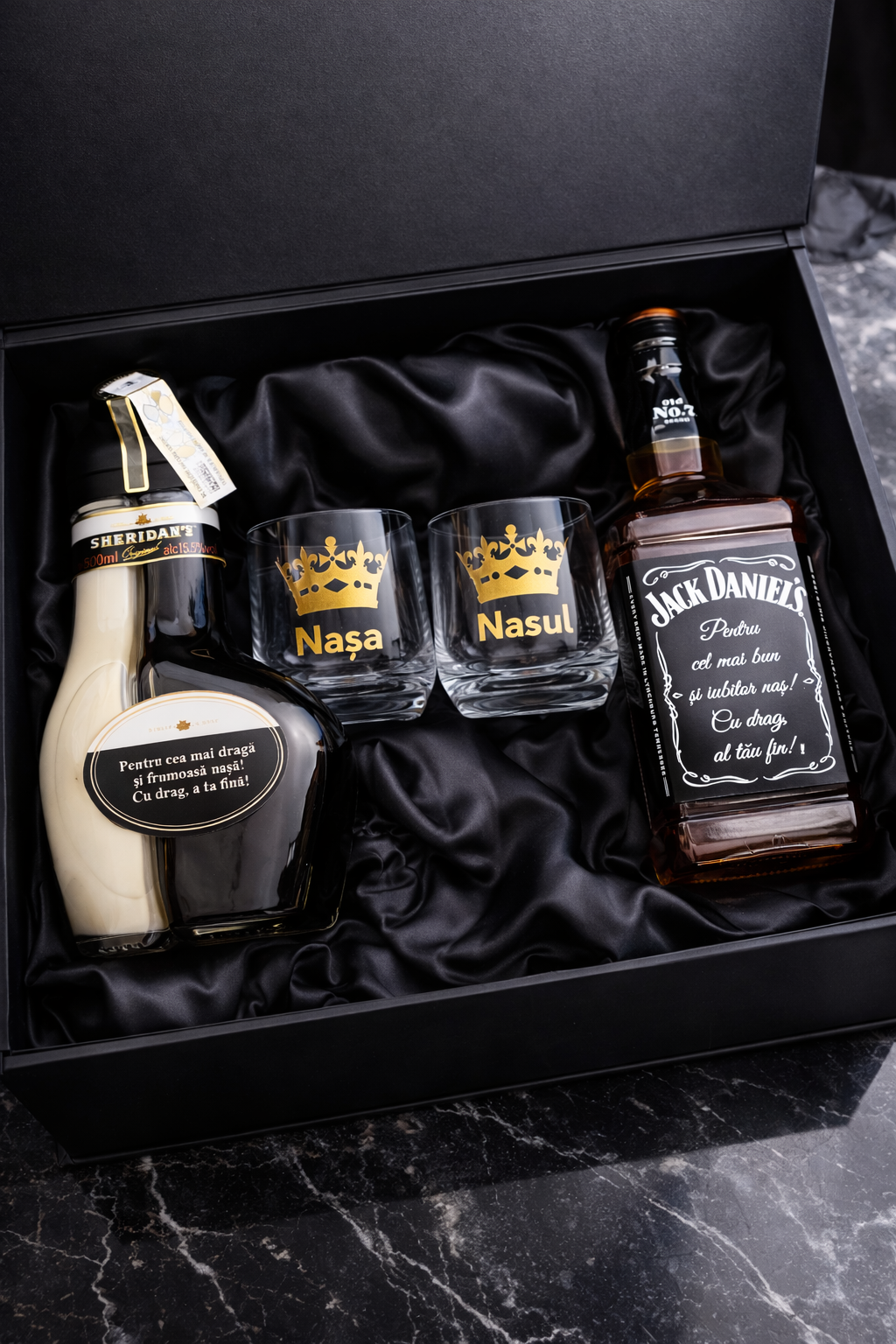 A fekete, selyem bélésű díszdoboz tartalma gondosan összeállított: egy üveg minőségi ital, egy különleges likőr, valamint két gravírozott pohár arany koronás mintával és személyre szabott felirattal.
