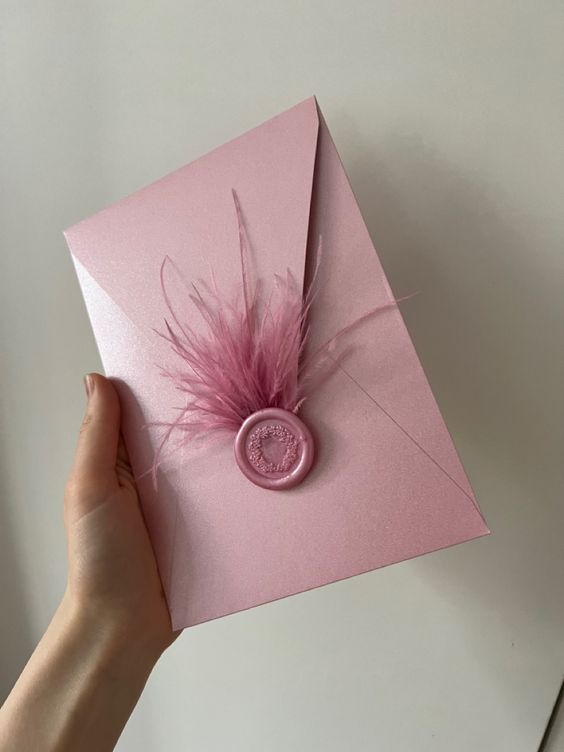 Személyre szabott boríték strucc tollal és viasz pecséttel.