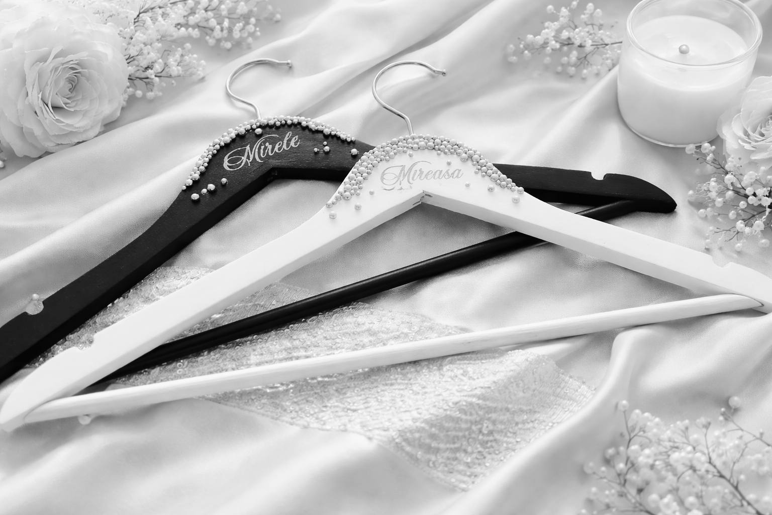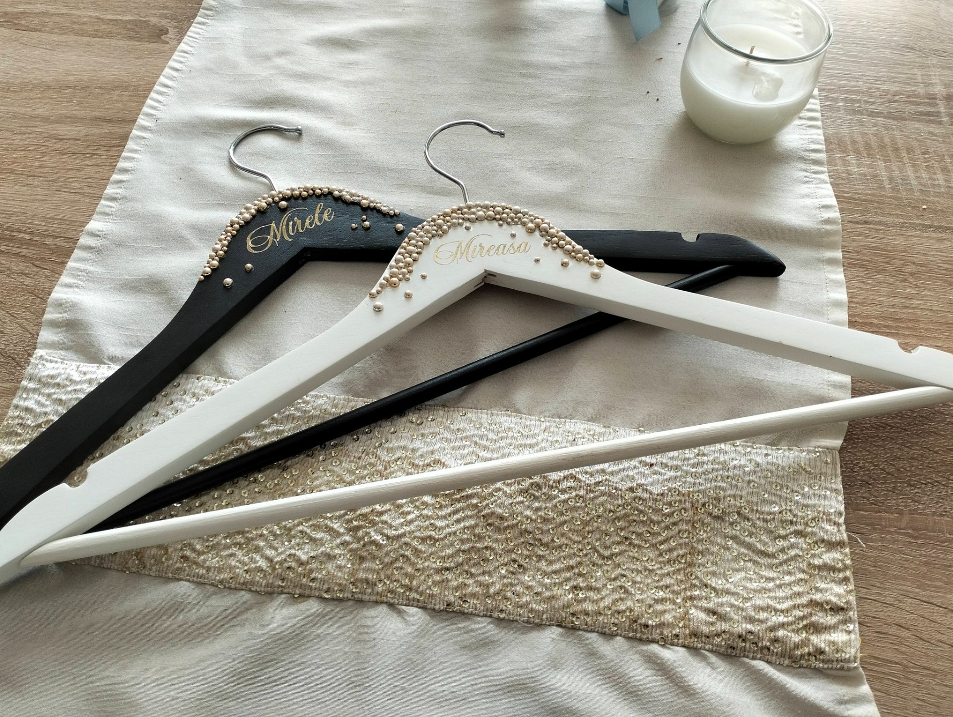 A menyasszony és a vőlegény számára készült akasztók egyedileg, névre szólóan készülnek, finom gyöngyökkel és ízléses részletekkel díszítve.