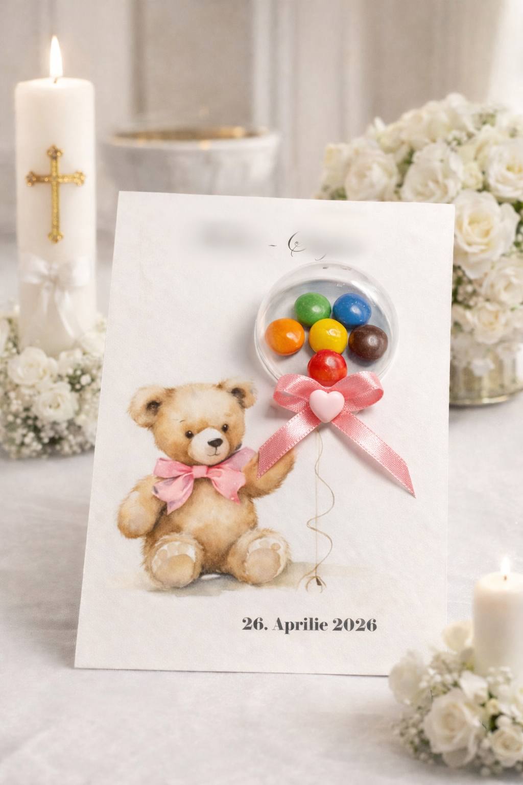 Invitație elegantă pentru botez, realizată în tonuri pastelate delicate și decorată cu un motiv adorabil de ursuleț în stil acuarelă. Detaliile atent lucrate, balonul transparent decorat cu panglică satinatǎ și scrisul caligrafic creează o atmosferă caldă și festivă. Alegerea perfectă pentru un eveniment de botez special și memorabil.