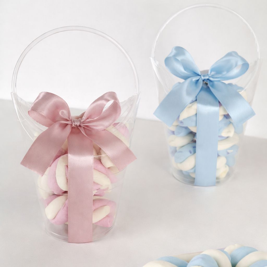 Elegáns és bájos "Sweet Dream" köszönőajándék, átlátszó dobozban, puha színű pillecukrokkal töltve.