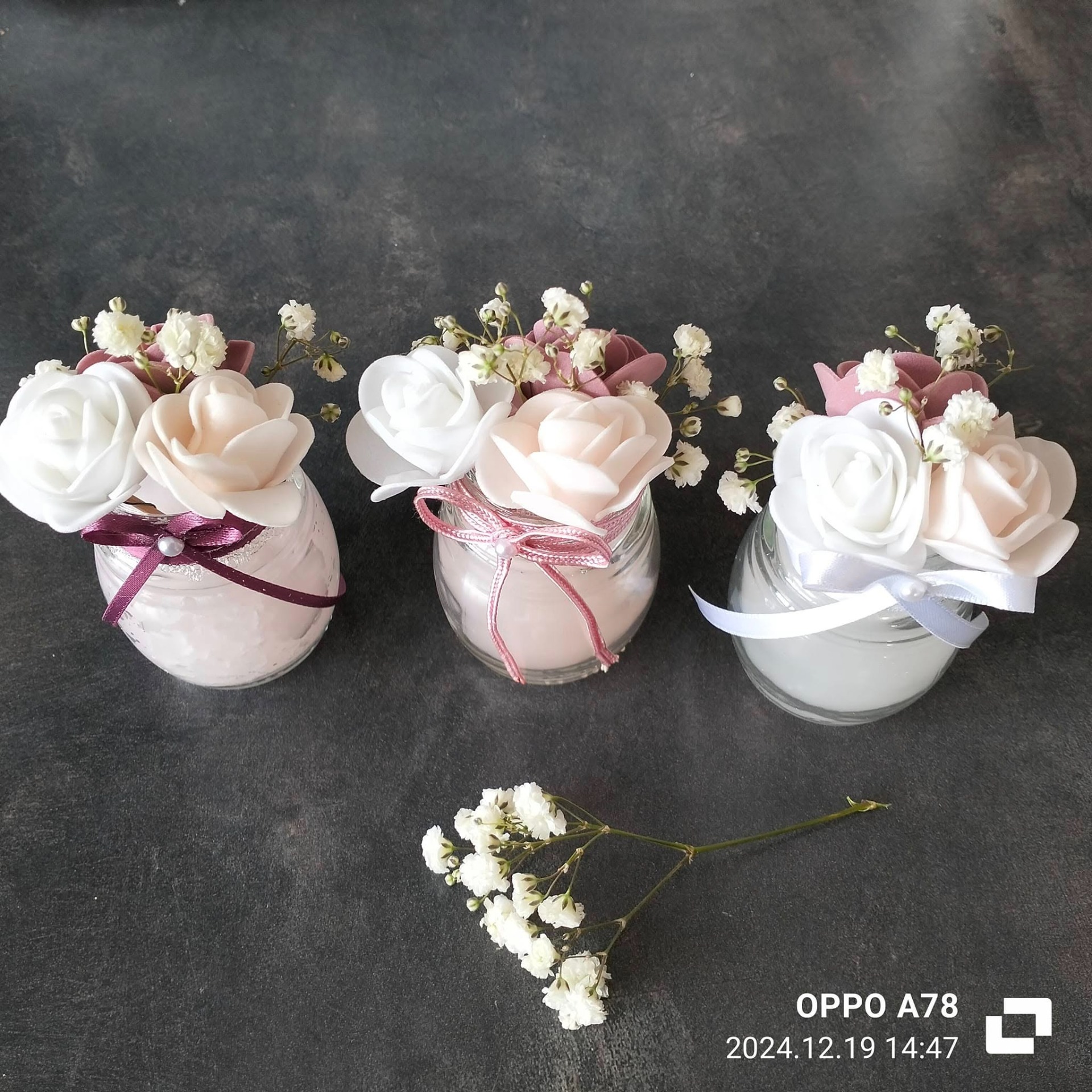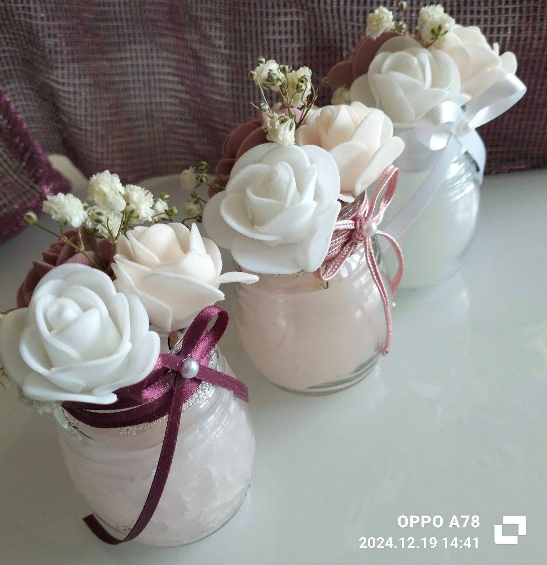Lumânare parfumată din ceară de soia, turnată într-un borcănel din sticlă.Borcănașele ușor de transportat și foarte versatile, căci pot fi personalizate în multe feluri și cum un minim de resurse pentru a se potrivi atmosferei pe care vrei să o imprimi evenimentului tău.Parfumul lumânării îl poți alege în funcție de tematica evenimentului, la fel si decorarea recipientului. Putem să colorăm ceara în nuanța pe care ți-o dorești sau să adăugăm sclipici – opțiune gratuită.Putem să decorăm vasele cu etichete (pe designul furnizat de tine), șnururi, panglici, flori din hârtie figurine, fire de lavandă/spice de grâu/flori din bumbac ș.a. – opțiune contra cost.Te rugăm să ne transmiți dorințele tale pe d.artdecoor@gmail.com, sau pe whatsapp/ telefon : 0771 314 609 și ne vom asigura că totul iese spectaculos.