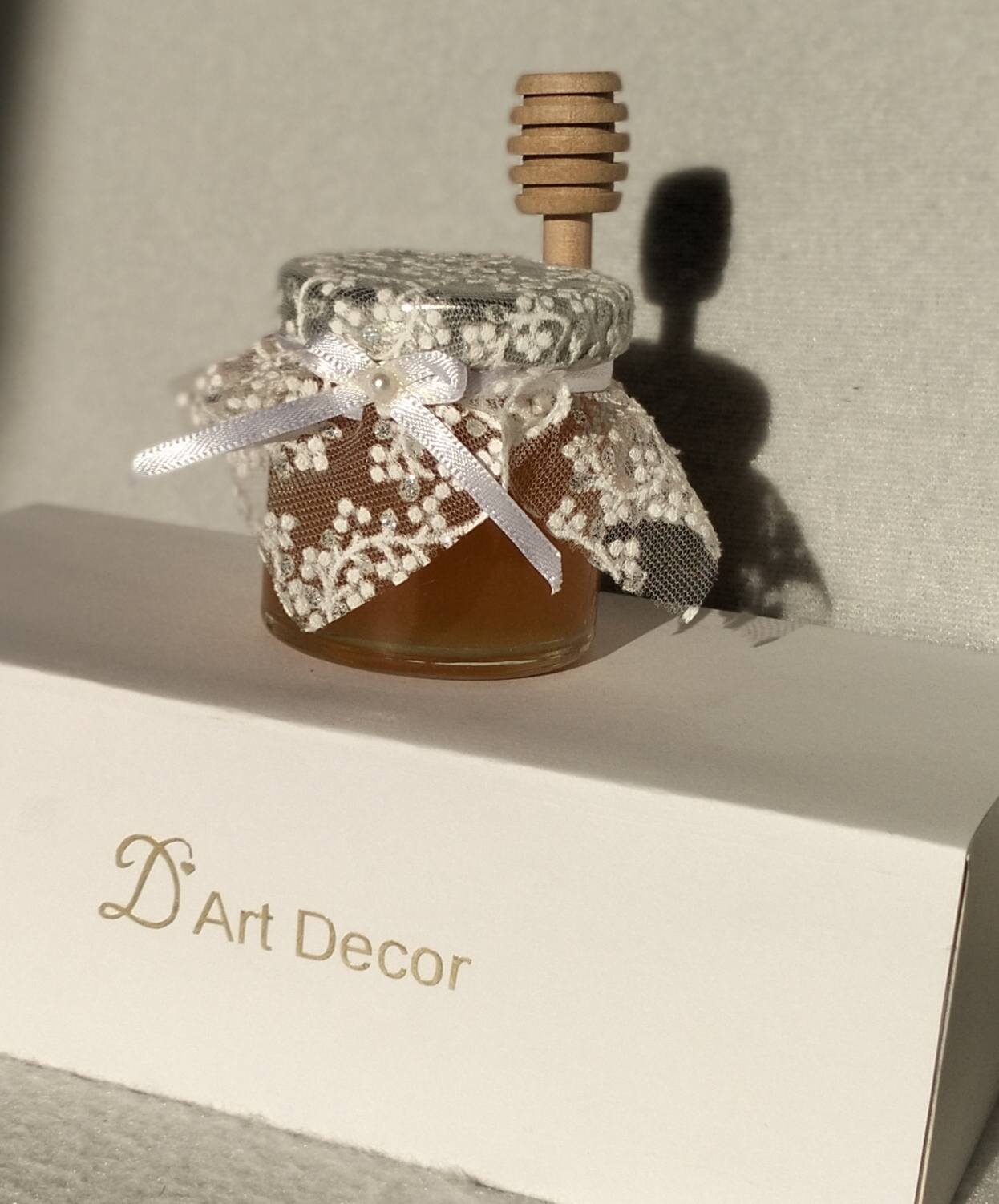 Marturii dulci cu miere, model hand made Eleganta – alb, borcan 50 gr.