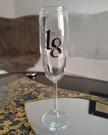 Pahar de sticla, personalizat cu sticker autocolant auriu, pentru majorat, implinirea a 18 ani.
