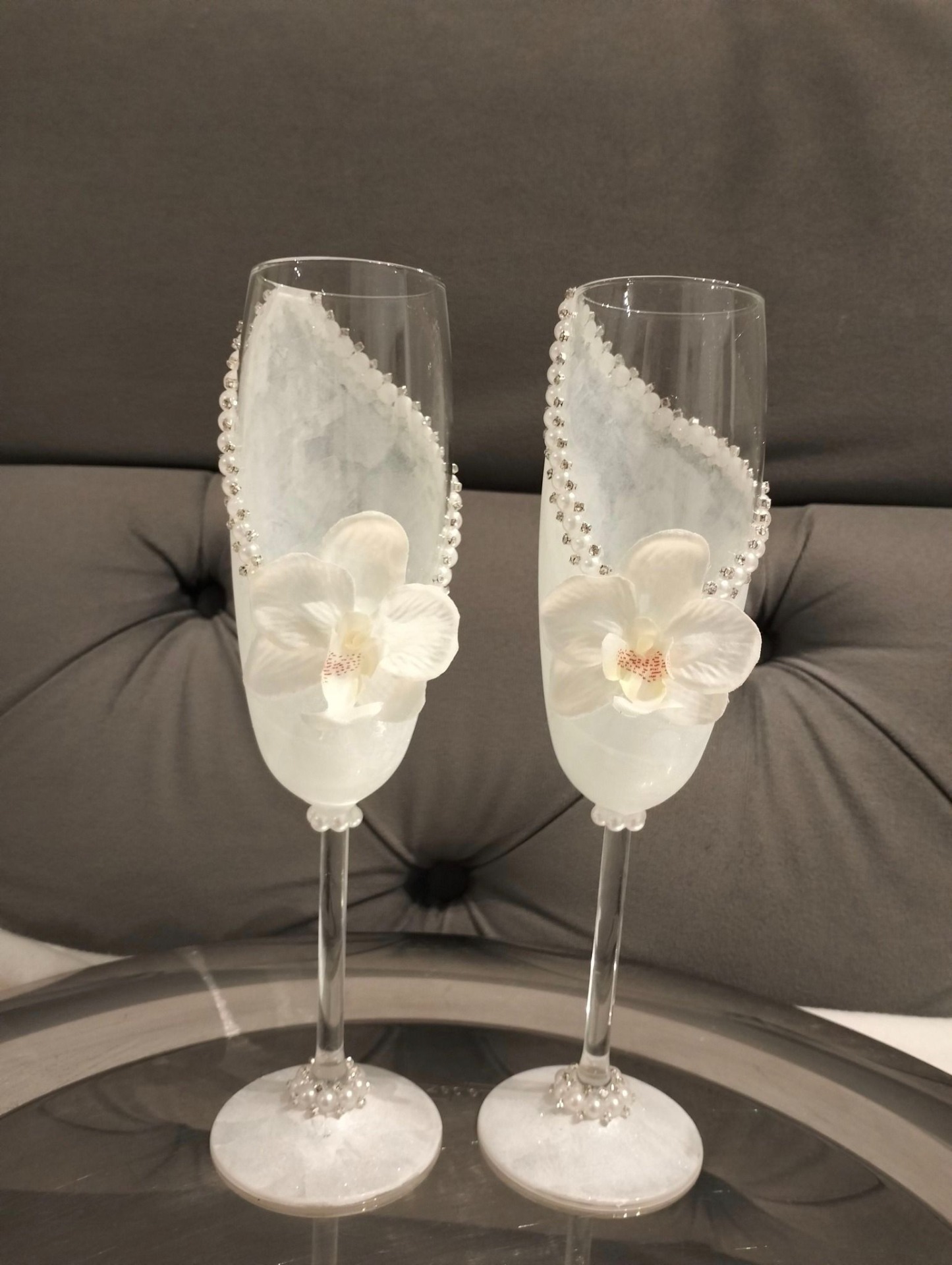 Paharele sunt decorate cu un design alb-lăptos special, completat de perle fine și accente strălucitoare. Elementul central este floarea de orhidee realizată manual, care oferă un aspect exclusiv și romantic.