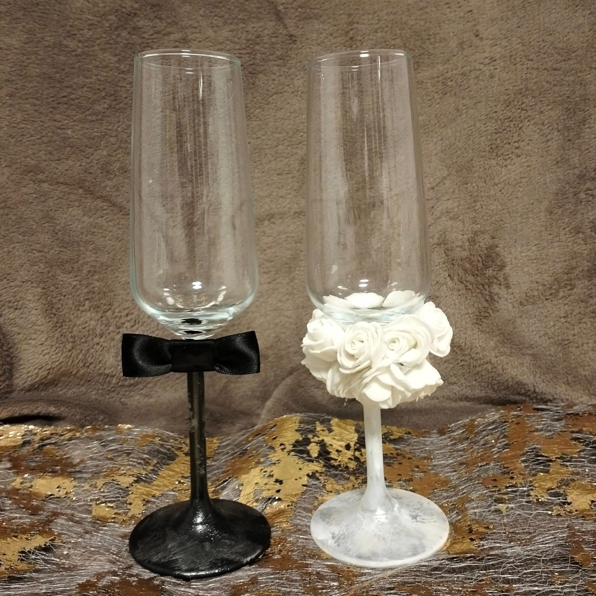Setul de pahare cristal potrivit pentru miri sau nasi, pictat cu multă atenție și migală și decorat cu flori modelate manual din lut polimeric.