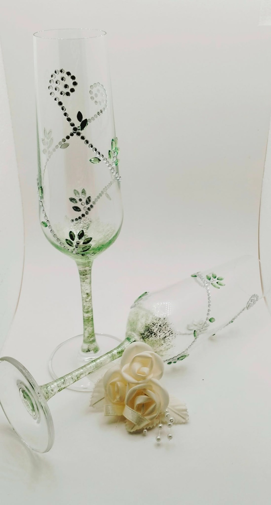 A kristálytiszta poharakat aprólékosan elhelyezett, csillogó kövek és smaragdzöld levélmotívumok díszítik, finoman ívelő mintázatban.