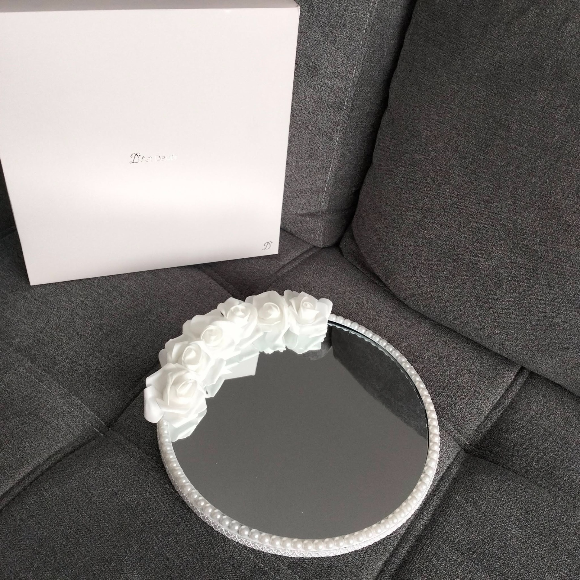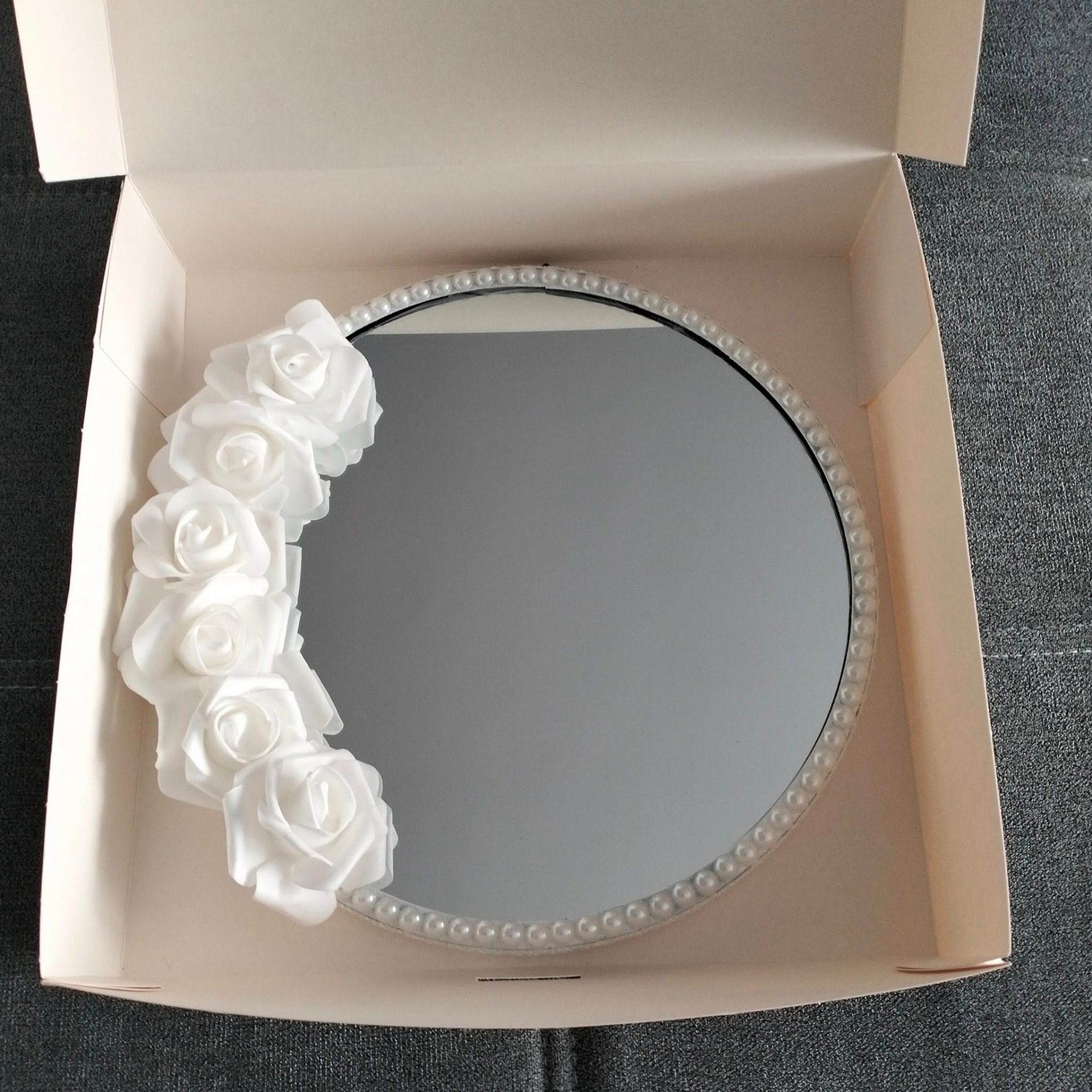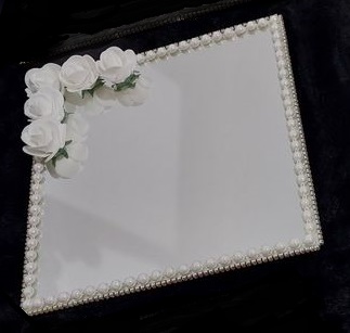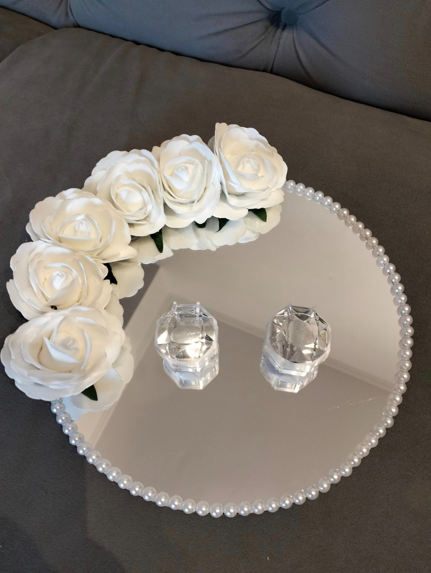 Transformă momentul schimbului de verighete într-o amintire de neuitat cu acest suport de verighete deosebit, realizat din oglindă de calitate, decorat manual cu flori artificiale elegante perlute și o fundă satinată. Accesoriul este prevăzut cu două casete pentru verighete și un mesaj emoționant